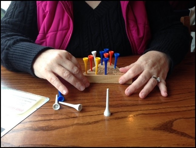 Have you played the Triangle Peg game? I'm kind of addicted. I've only gotten down to one peg once. ONCE! What's crazy is that I thought once I solved it I would be able to solve it again and again. Turns out I can't actually remember how I did it that one time.
